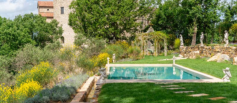 Beside the pool, a natural shady area shelters patrons, inviting them to spend hours of pure relaxation amid natural, thirst-quenching drinks and glasses of prosecco. Every dip feels like an invitation to plunge into a dream, while the view of the castle, towering above, adds a touch of magic to this corner of paradise.